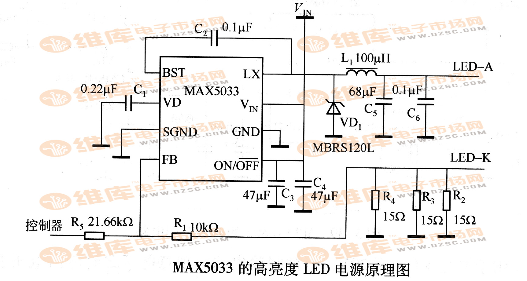 • MAX5033的高亮度LED電源原理圖